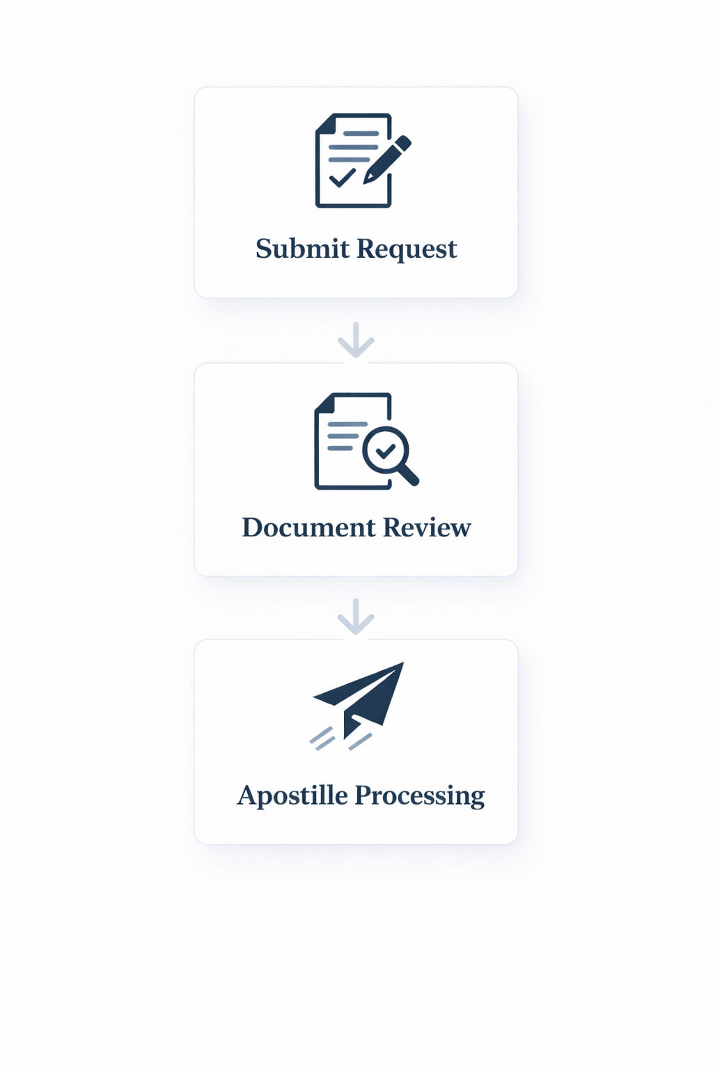 This fee covers document review, preparation, and submission coordination for apostille processing.• Standard processing: 3–5 business days